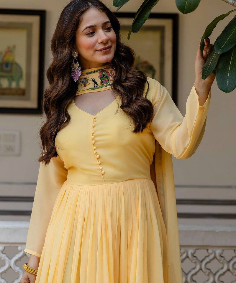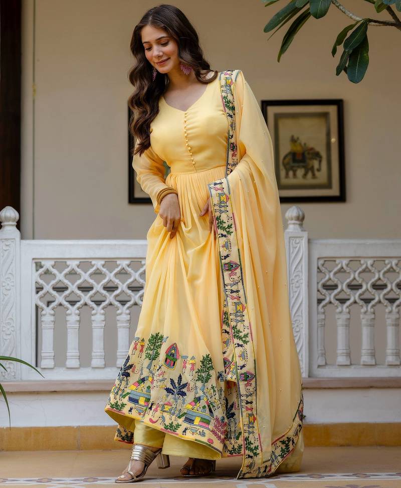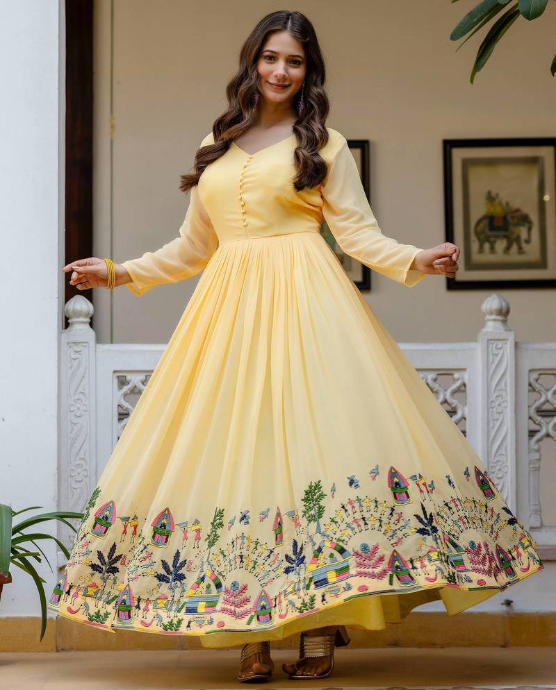 Yellow color faux georgette embroidery work designer wedding wear gown stitched