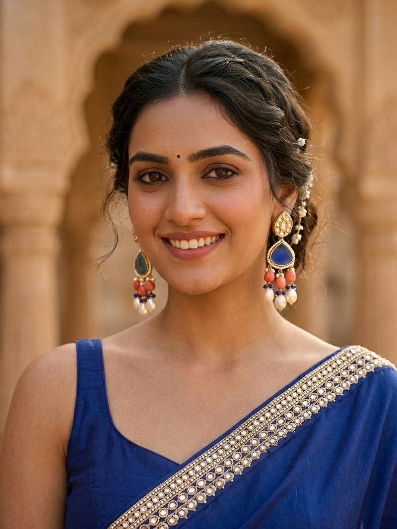 | Product Description | Add A Touch Of Royal Elegance To Your Ethnic Look With These Beautifully Crafted Traditional Dangle Earrings. Featuring A Stunning Deep Blue Triangular Stone Centerpiece, These Earrings Are Highlighted With Delicate White Bead Detailing And An Ornate Top Stud Design. The Lower Section Is Adorned With Coral Toned Carved Beads And Graceful Pearl Drops, Creating A Charming Layered Look That Moves Beautifully With Every Step.Perfect For Weddings, Festive Occasions, Parties, And Traditional Outfits, These Statement Earrings Complement Sarees, Lehengas, And Ethnic Gowns Effortlessly. The Elegant Combination Of Blue Stones, Pearls, And Gold Tone Finish Makes Them A Timeless Addition To Your Jewellery Collection. |