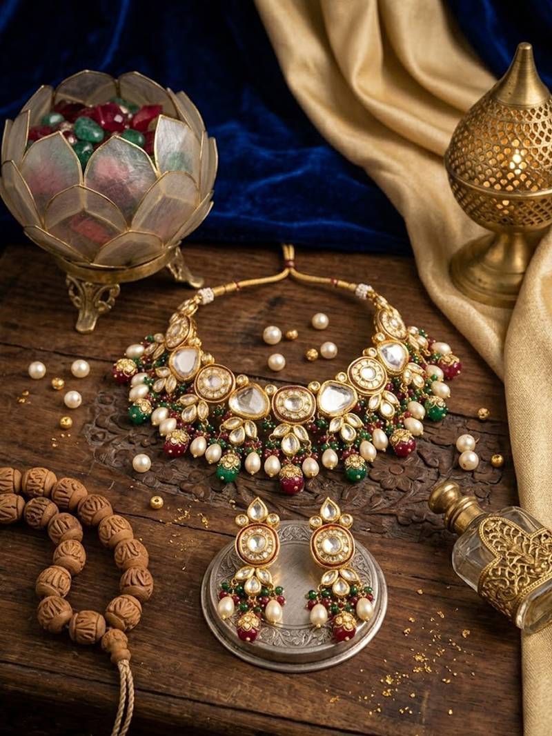 | Product Name | Traditional Gold Plated Kundan Necklace Set With Pearl Drops & Green Red Beads For Women | |