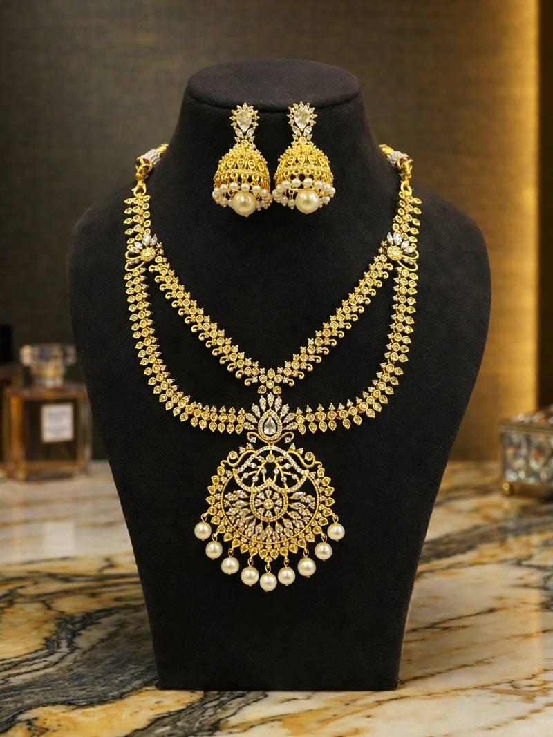 | Product Description | Make A Grand Style Statement With This Stunning Traditional Layered Necklace Set. Designed With Intricate Craftsmanship, The Necklace Features A Beautiful Dual Layer Pattern Adorned With Sparkling Stones And Delicate Gold Toned Detailing. The Centerpiece Pendant Showcases An Ornate Circular Design Embellished With Shimmering Stones And Elegant Pearl Drops That Add A Graceful Charm. The Set Is Paired With Classic Jhumka Earrings Decorated With Pearls And Stone Accents, Perfectly Complementing The Necklace. Ideal For Weddings, Festive Occasions, And Special Celebrations, This Elegant Jewelry Set Pairs Beautifully With Sarees, Lehengas, And Other Traditional Outfits To Create A Regal And Sophisticated Look. |