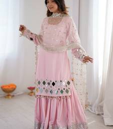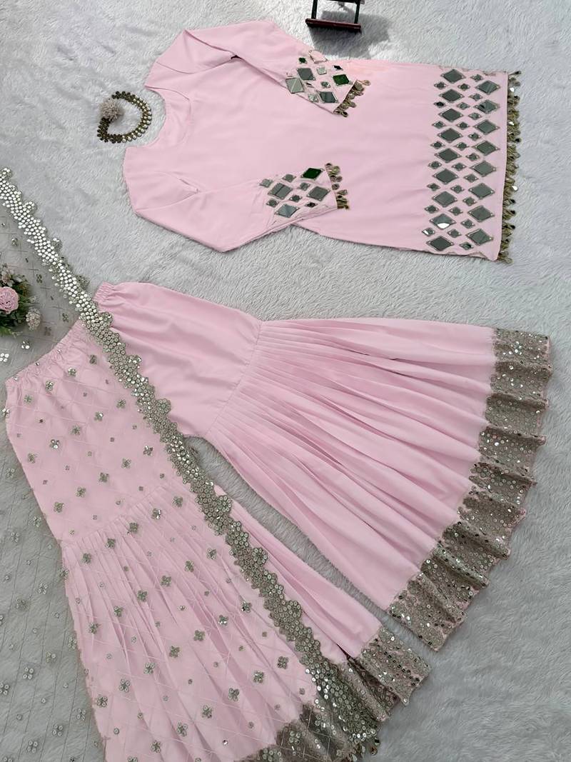 Beautiful baby pink mirror work crepe eid special sharara suit stitched