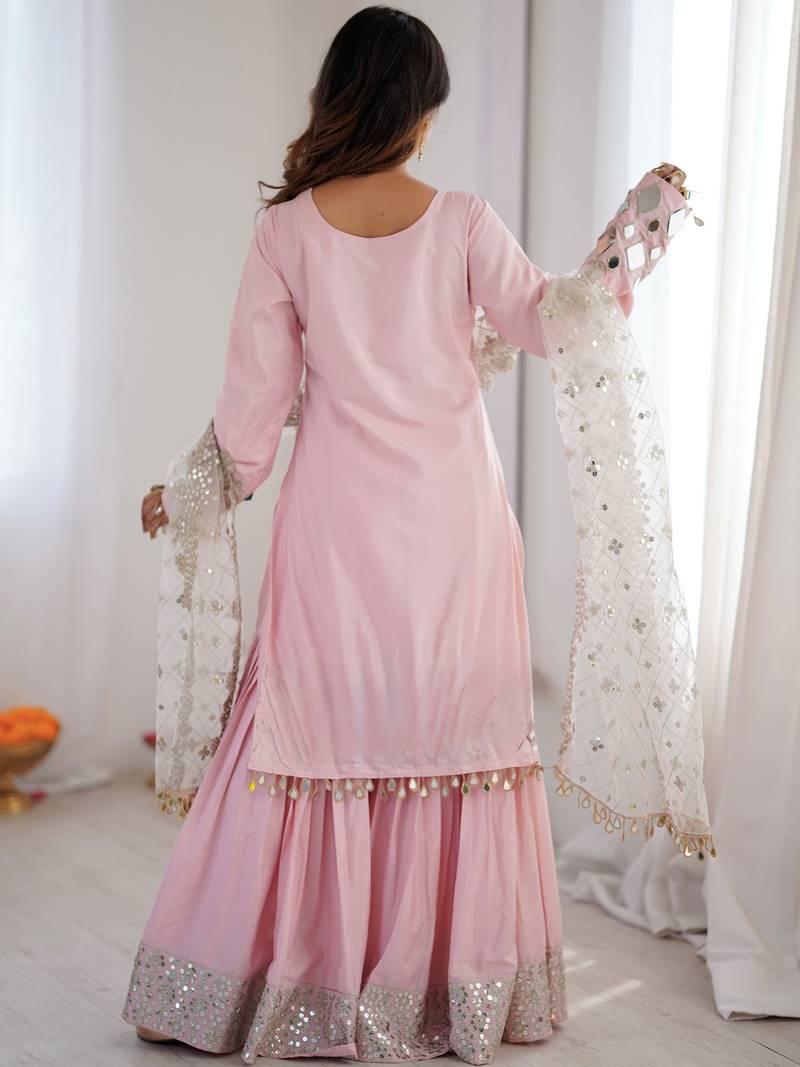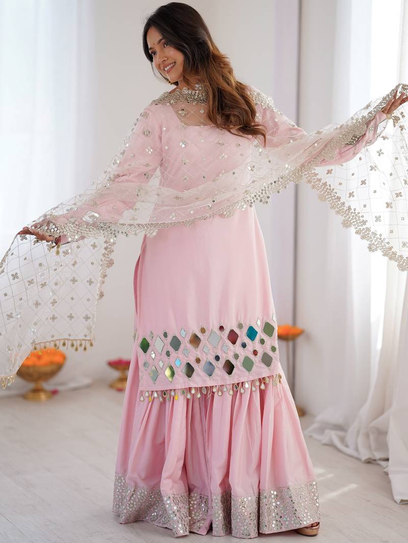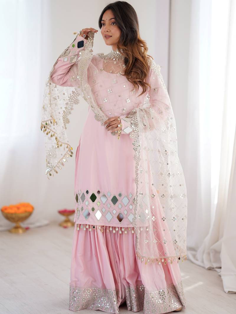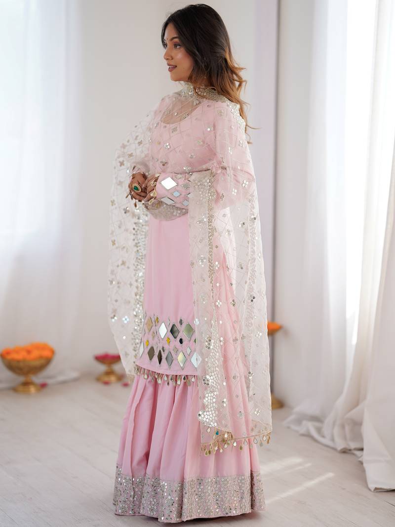 Beautiful Baby Pink Mirror Work Crepe Eid Special Sharara Suit