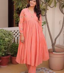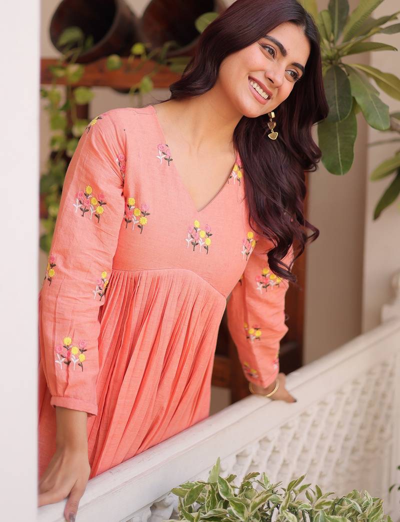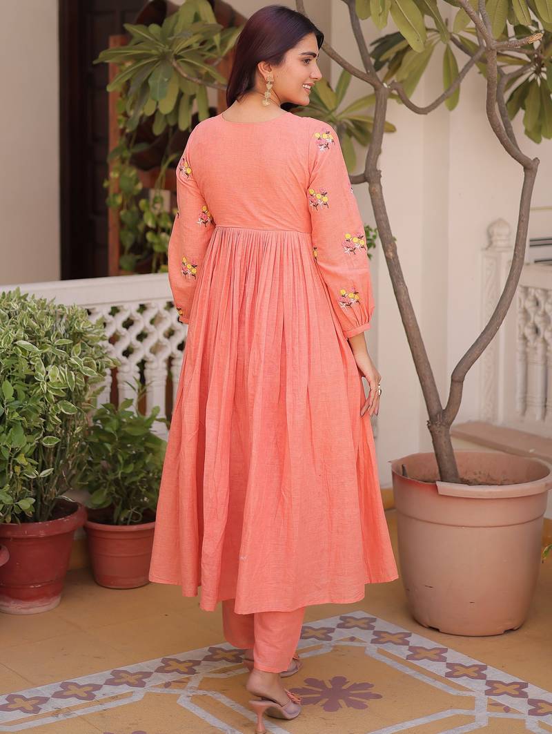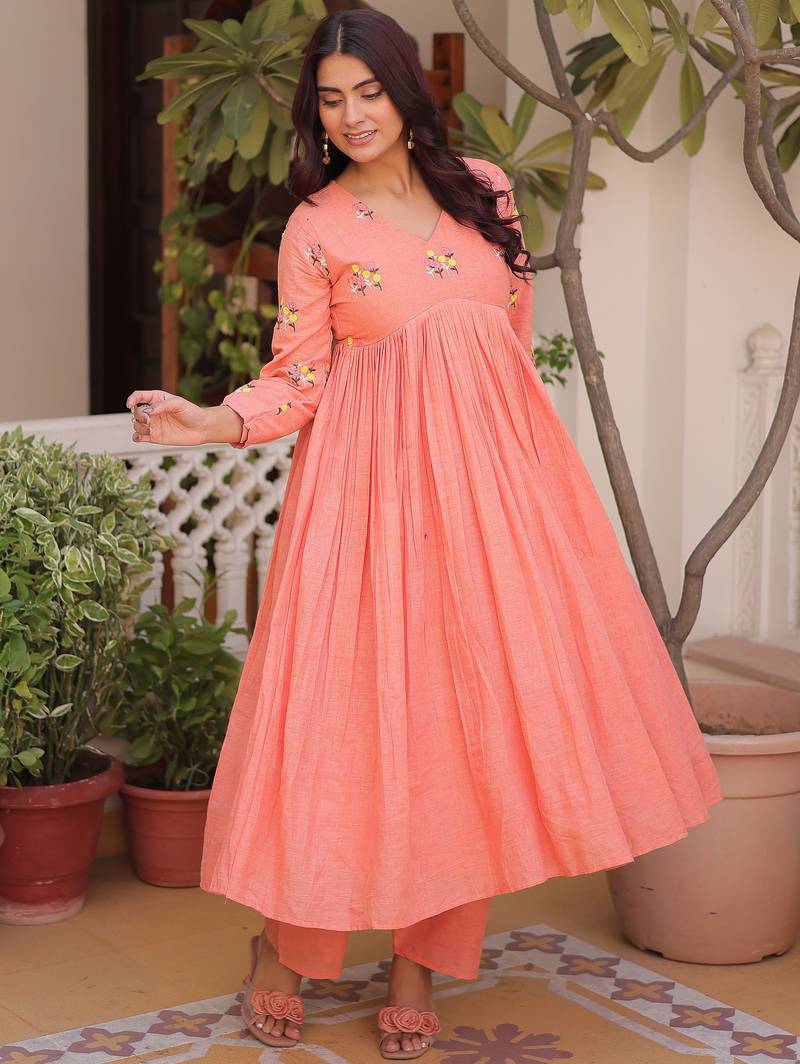 Soft And Elegant, The Kurti Comes In A Beautiful Peach Cotton Color With Delicate Yellow, Pink, And Green Floral Embroidery, Adding A Graceful Touch To The Soft Base.