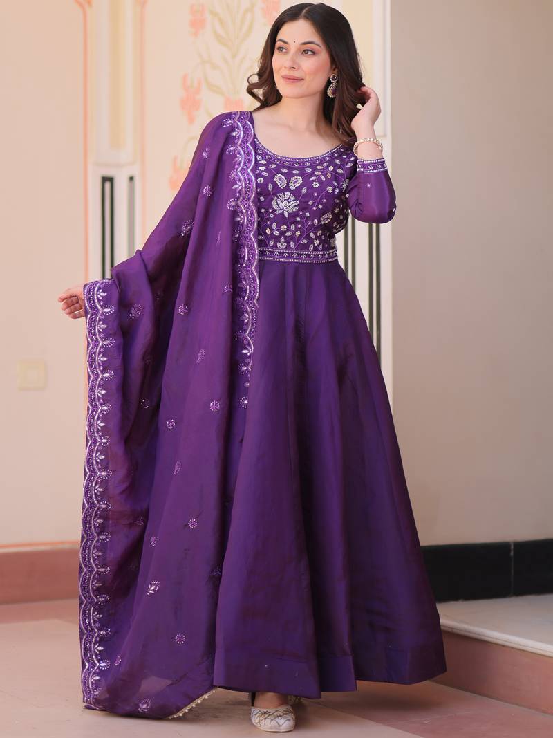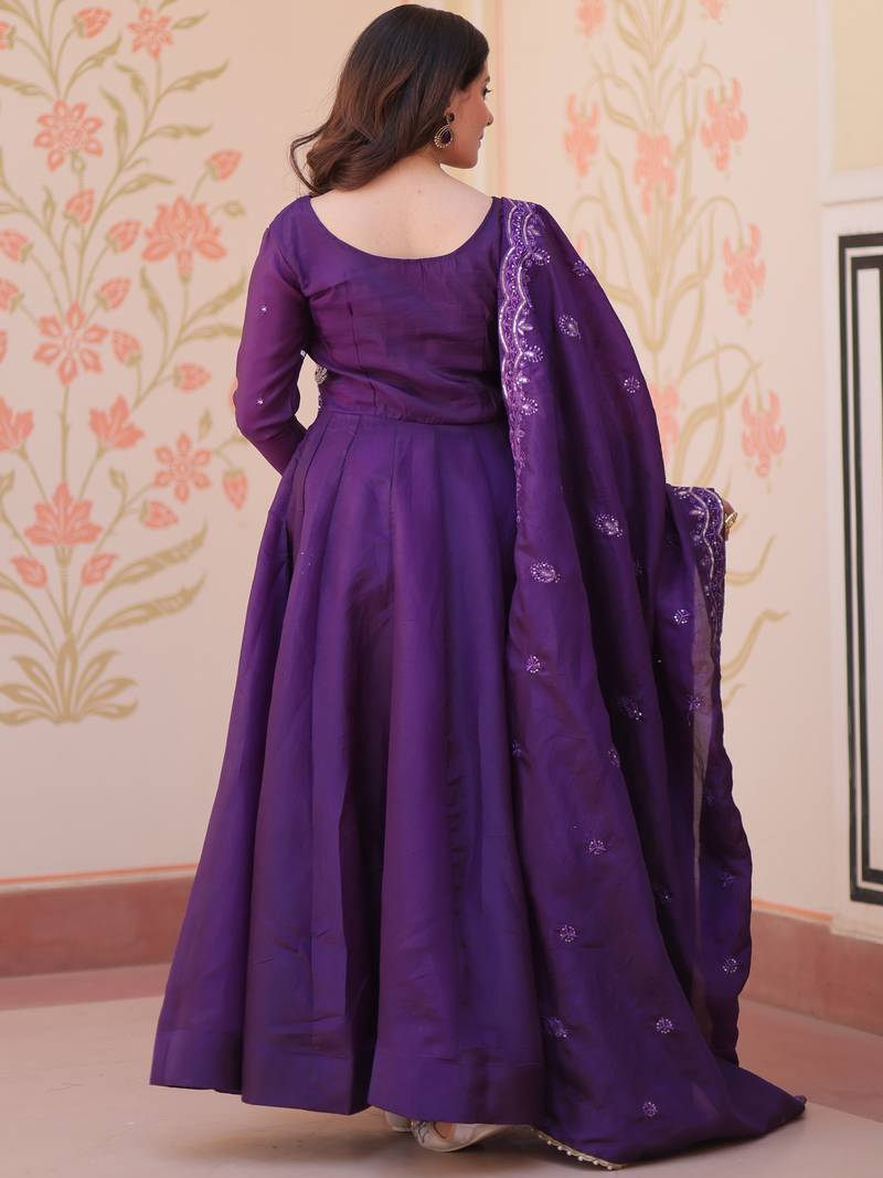 | Product Description | Presenting A Striking Royal Purple Anarkali Gown, Designed In A Deep, Rich Violet Tone That Brings A Bold And Elegant Festive Appeal. The Gold Crush Fabric Is Enhanced With Silver Bead Embroidery, Creating A Beautiful Contrast Over The Purple Base.