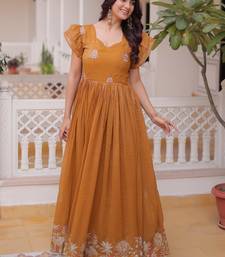 Designed With A 56 Inch Length And Full Cotton Inner Lining, This Mustard Yellow Embroidered Organza Gown Is Available In M, L, Xl, And Xxl Sizes, Perfect For Festive Events And Traditional Occasions.