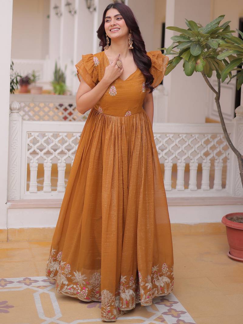 The Gown Features Double Frill Sleeves In Matching Mustard Color And A Fancy V Neck Design, Enhancing The Feminine Style Of The Outfit. The Balanced Color Details Make The Gown Look Elegant And Refined.