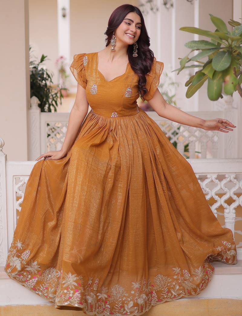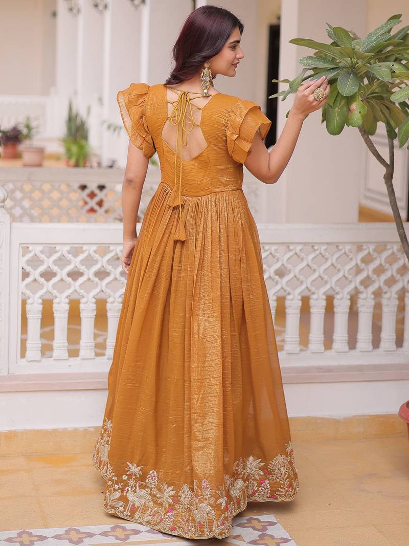 This Elegant Mustard Yellow Gown Features A Rich Golden Mustard Shade That Gives The Outfit A Warm And Festive Look. The Organza Fabric Adds A Soft Sheen, While The Golden Thread Embroidery Blends Beautifully With The Mustard Base.