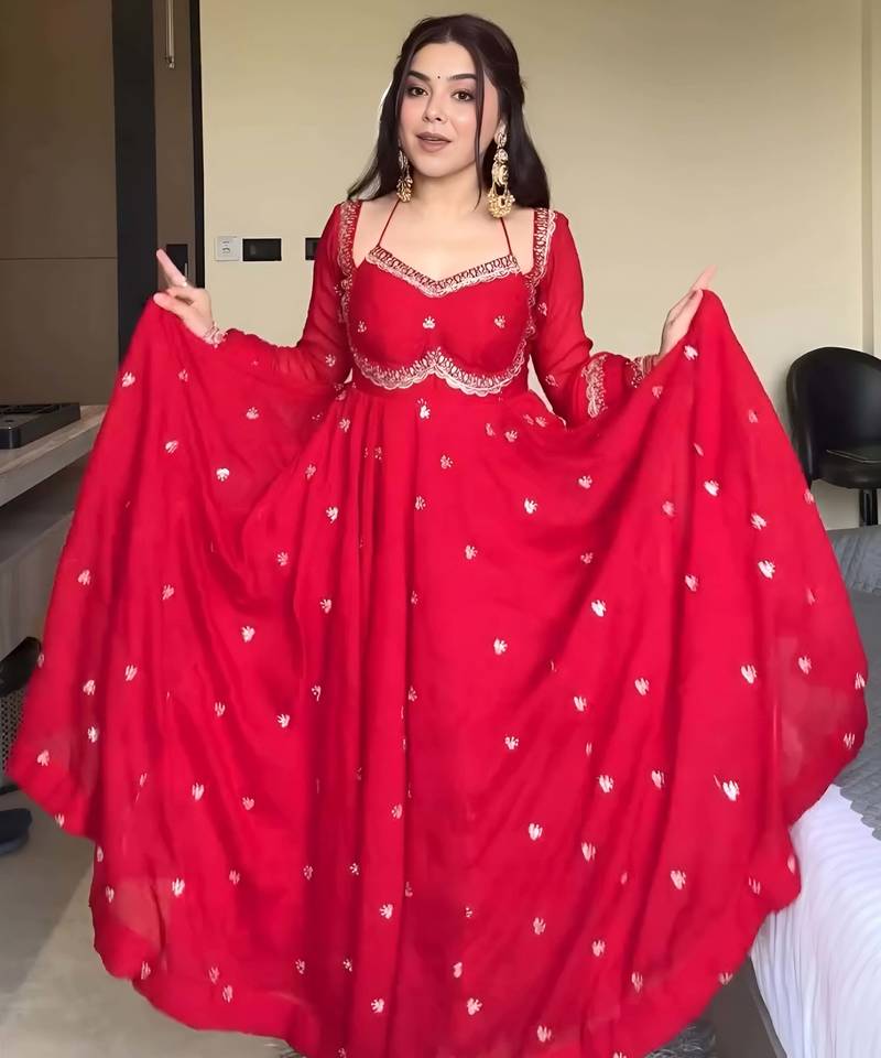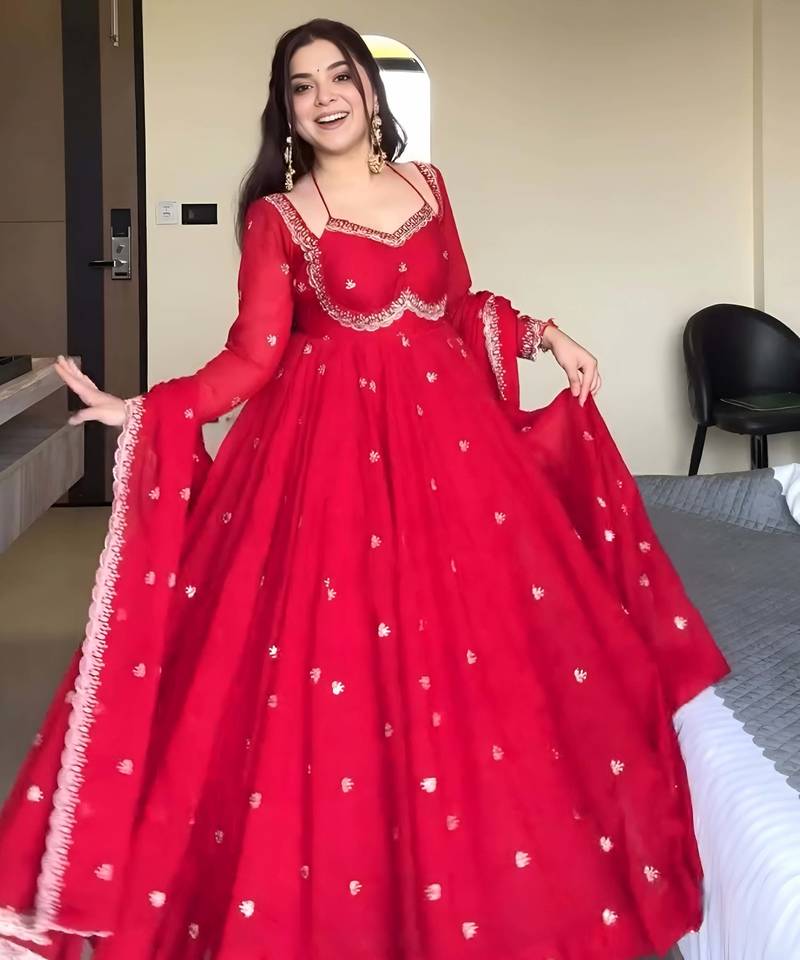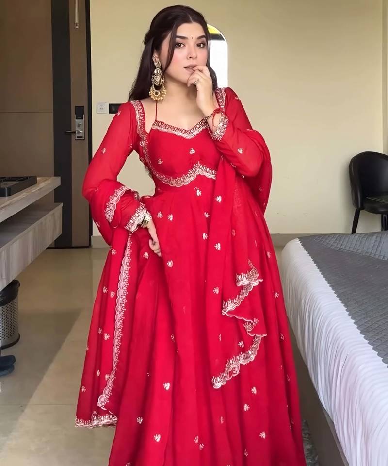 Elegant stylish red georgette embroidered anarkali style kurta set with dupatta & pant