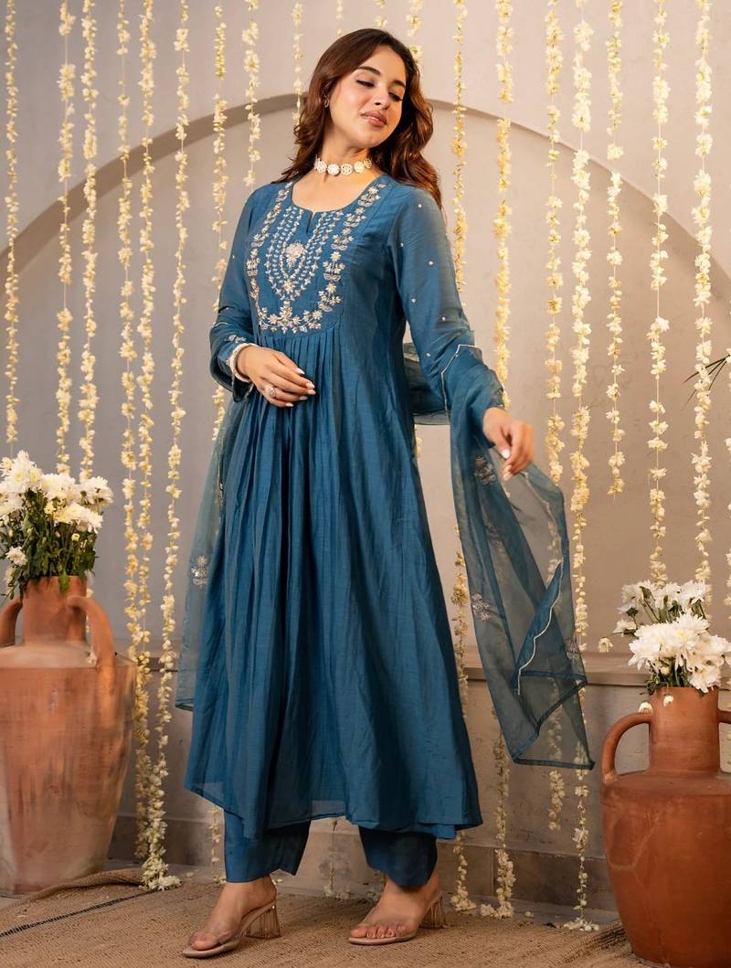 Step Into Timeless Elegance With This Beautifully Crafted Anarkali Kurta Set, Designed To Bring Out Grace And Sophistication In Every Movement. Made From Premium Quality Fabric, This Ethnic Ensemble Features A Flowy Silhouette That Enhances Comfort While Maintaining A Regal Appeal—Perfect For Festive Occasions, Weddings, And Traditional Gatherings.The Kurta Showcases Intricate White Thread Embroidery On The Yoke, Inspired By Classic Floral And Heritage Motifs, Adding A Delicate Yet Luxurious Touch. The Finely Pleated Flare From The Waist Creates A Flattering Anarkali Style, Giving A Voluminous And Graceful Fall. Full Length Sleeves With Subtle Embroidered Detailing Further Elevate The Look, Making It Ideal For Both Day And Evening Wear.Paired With A Matching Dupatta, This Set Offers A Complete Traditional Look. The Dupatta Is Lightweight And Sheer, Enhancing The Overall Outfit With A Soft, Elegant Drape. Complemented By Straight Fit Pants, The Outfit Ensures Both Style And Ease Of Movement.