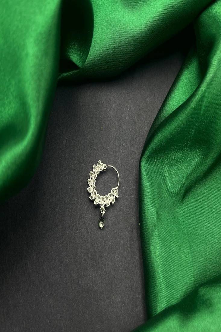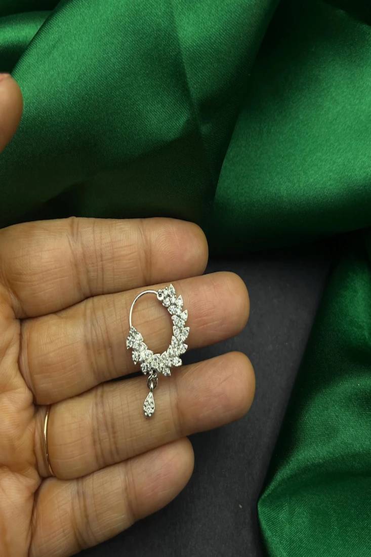 | Product Description | Add Timeless Elegance To Your Look With This Beautifully Crafted Silver Finish Floral Nose Ring. Designed With Sparkling Cubic Zirconia Stones Arranged In A Delicate Leaf Pattern, This Nose Ring Features A Charming Teardrop Dangle That Enhances Its Traditional Appeal. Perfect For Bridal Wear, Festive Occasions, Weddings, And Cultural Celebrations, This Lightweight Nose Ring Offers A Secure And Comfortable Fit While Making A Graceful Statement. Style It With Sarees, Lehengas, Or Fusion Outfits For A Classic Yet Modern Touch. A Must Have Piece For Lovers Of Ethnic And Traditional Jewelry. |