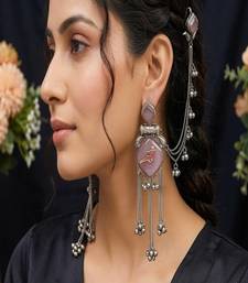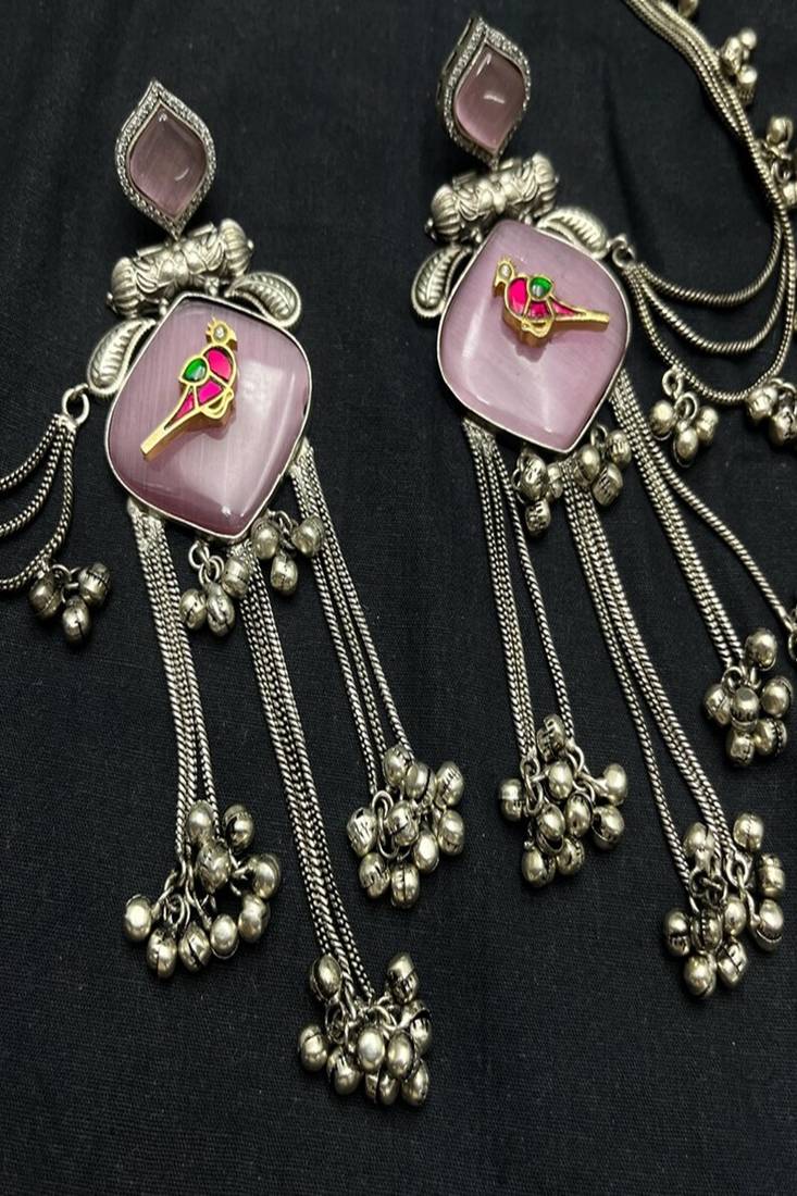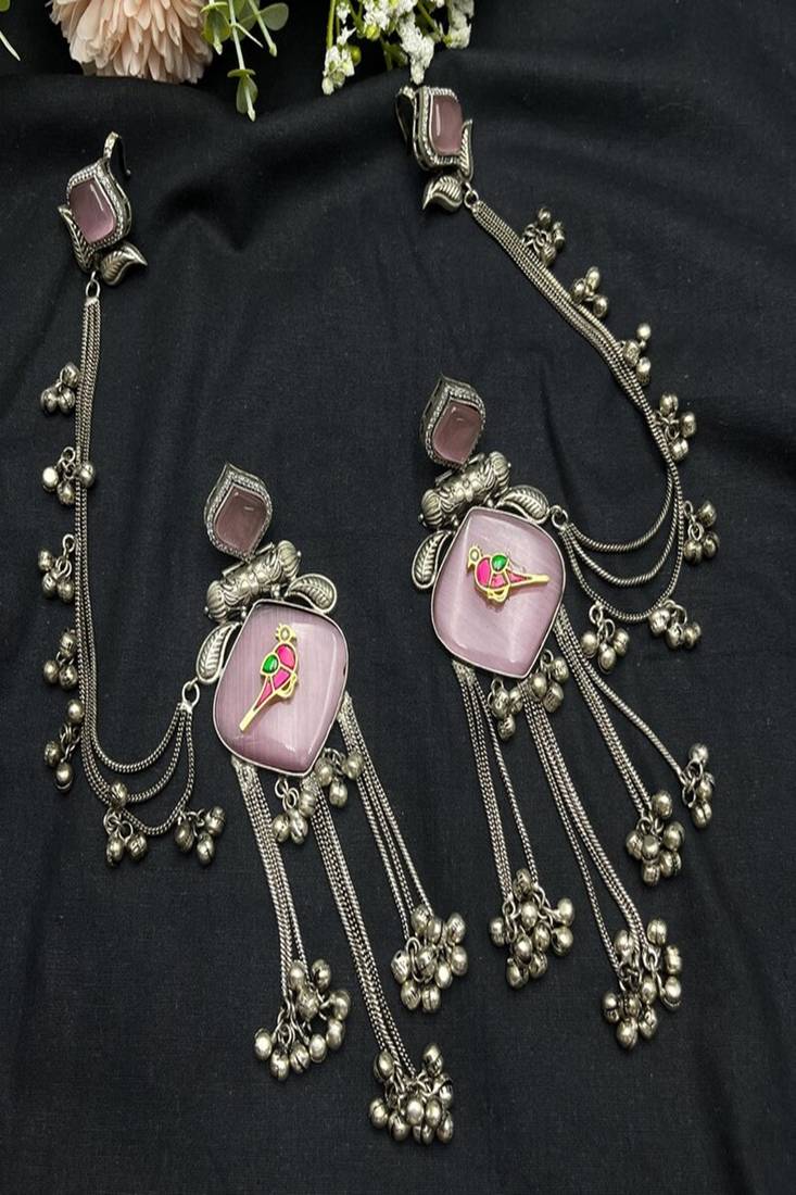 | Product Name | Mauve Pink Oxidized Silver Bird Earrings With Kanauti Earchain, Indian Bahubali Jhumka With Hair Sahare | |