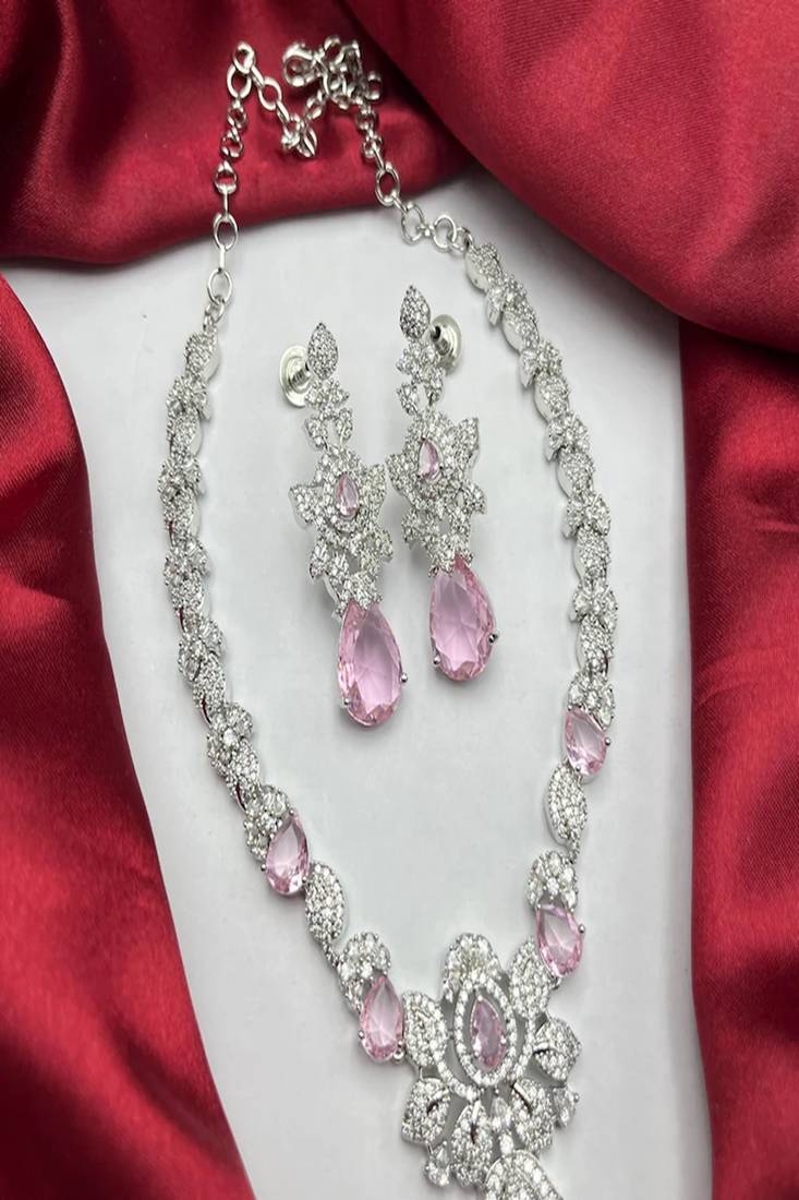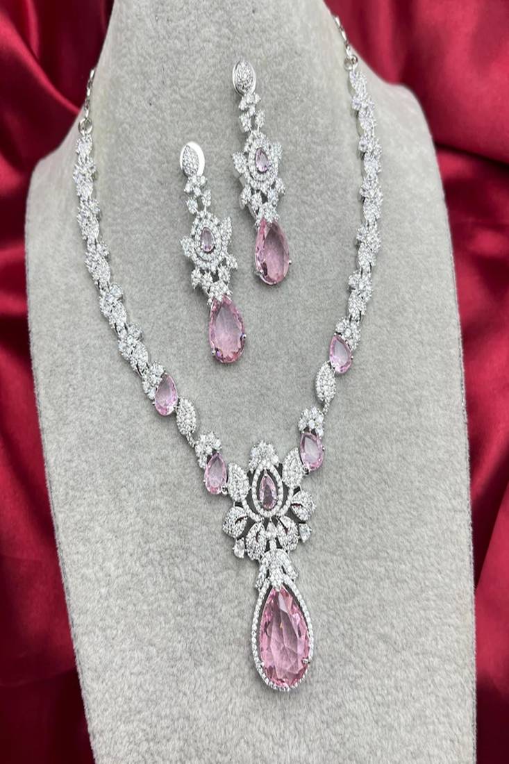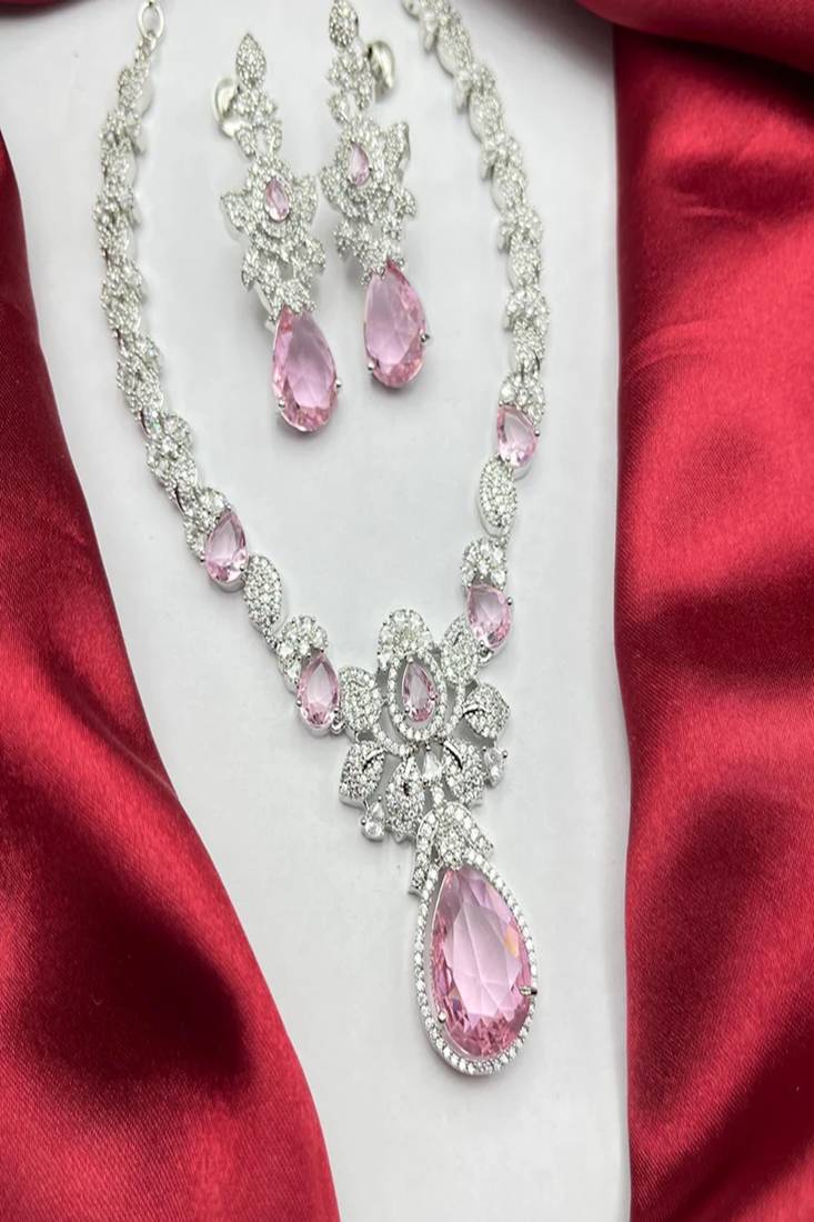 | Product Description | Elegant Pink Crystal Necklace And Earrings Set | Silver Bridal Jewelry | Teardrop Cz Wedding Necklace | Sparkling Statement Jewelry Gift