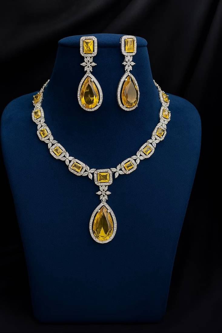 | Product Description | Add Elegance And Glamour To Your Special Occasion With This Luxury Yellow Crystal Necklace And Earrings Set. Designed With Brilliant Square And Teardrop Shaped Yellow Gemstones Surrounded By Sparkling Cz Stones, This Statement Jewelry Set Is Perfect For Brides, Bridesmaids, Wedding Guests, And Party Wear.