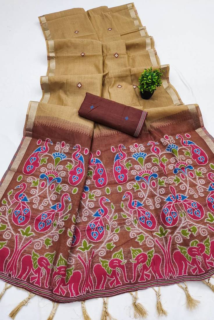 | Product Description | Saree : Soft Pure Muga Cotton Saree With Meenakari Weaving Touchup Motifs Design All Over The Saree & Meenakari Weaving Rich Flowery Pallu With Zari Weaving Small Border & Beautiful Tassels Attached At Pallu End. Blouse : Cotton Weaving Contrast Blouse Piece With Sleeve Border. |