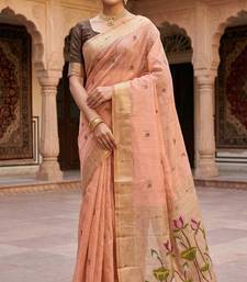 Peach muga cotton meenakari & munia weaving pallu saree with contrast blouse